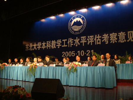 在为期7天的评估和考察中,专家组以教育部本科教学工作水平评估指标体系为依据,并根据教育部《关于进一步加强高等学校本科教学工作的若干意见》和《关于做好2005年普通高等学校本科教学工作水平评估的通知》的文件精神,认真阅读了东北大学本科教学工作水平评估自评报告和背景材料;参观了学校教育教学成果展;考察了学校教学楼、图书馆、校园网、体育运动中心等主要公共教学设施;考察了国家工科基础课程电工电子教学基地、物理实验教学中心、工程训练中心、化学实验室、计算机软件国家工程研究中心和国家数字化医学影像设备工程技术研究中心等实验室与中心;考察了秦皇岛分校、学生公寓、食堂并巡视了学生早操、晚自习等情况;走访了文法学院、工商管理学院、理学院、资源与土木工程学院、材料与冶金学院、机械工程与自动化学院、信息科学与工程学院、外国语学院、基础学院、软件学院、艺术学院和体育部等院(部)和教务处、人事处、财务处、科技处、研究生院、学生工作处、资产管理处、团委等部门;分别召开了教务处领导及相关科室人员、教学管理人员、基础课教师、专业课教师及学生等专题座谈会;应邀参加文化素质汇报演出活动。