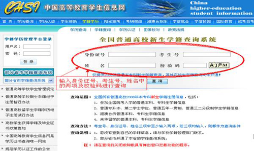 教育部查询网站:“全国普通高校学籍查询系统”(公网:http://xjxl.chsi.com.cn/;教育网:http://xjxl.chsi.cn/),凭考生号、身份证号、姓名三项中的两项及校验码登录,查询本人的学籍电子注册信息,并与校内教务处网站的学籍信息相比较,若学籍信息与实际情况不符,请附户口本、身份证复印件报到学院教学办,由教学办集中上报教务处核改。